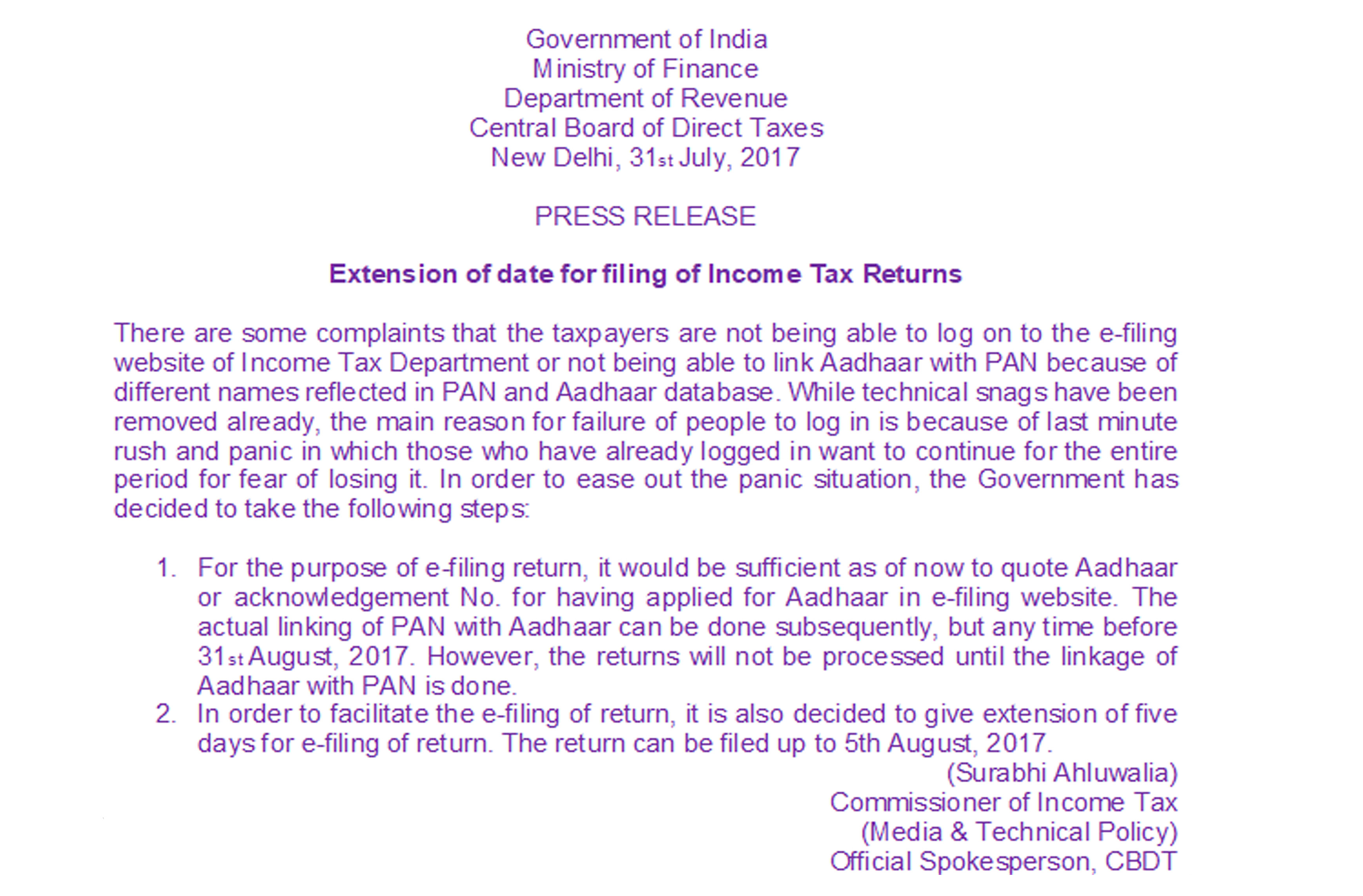 As per Press Release of the Central Board of Direct Taxes, Department of Revenue Ministry of Finance, Government of India, New Delhi dated 31st July, 2017, the due date of filing of Return of Income under the Income Tax Act, 1961, falling on 31/07/2017 is extended to 05-08-2017.